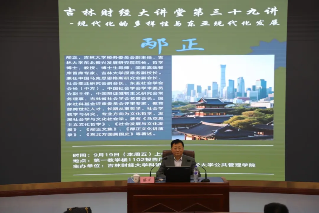 受吉林财经大学科研处及星空·体育(中国)官方网站 邀请,吉林大学校务委员会副主任、东北振兴发展研究院院长、博士生导师邴正教授作了《现代化的多样性与东亚现代化发展》主题学术报告。邴正教授担任国家高端智库首席专家等多项学术职务,长期致力于文化哲学、发展社会学与文化社会学的研究。报告由星空·体育(中国)官方网站 院长李阳主持,李阳院长代表主办方对邴正教授的到来表示热烈欢迎。